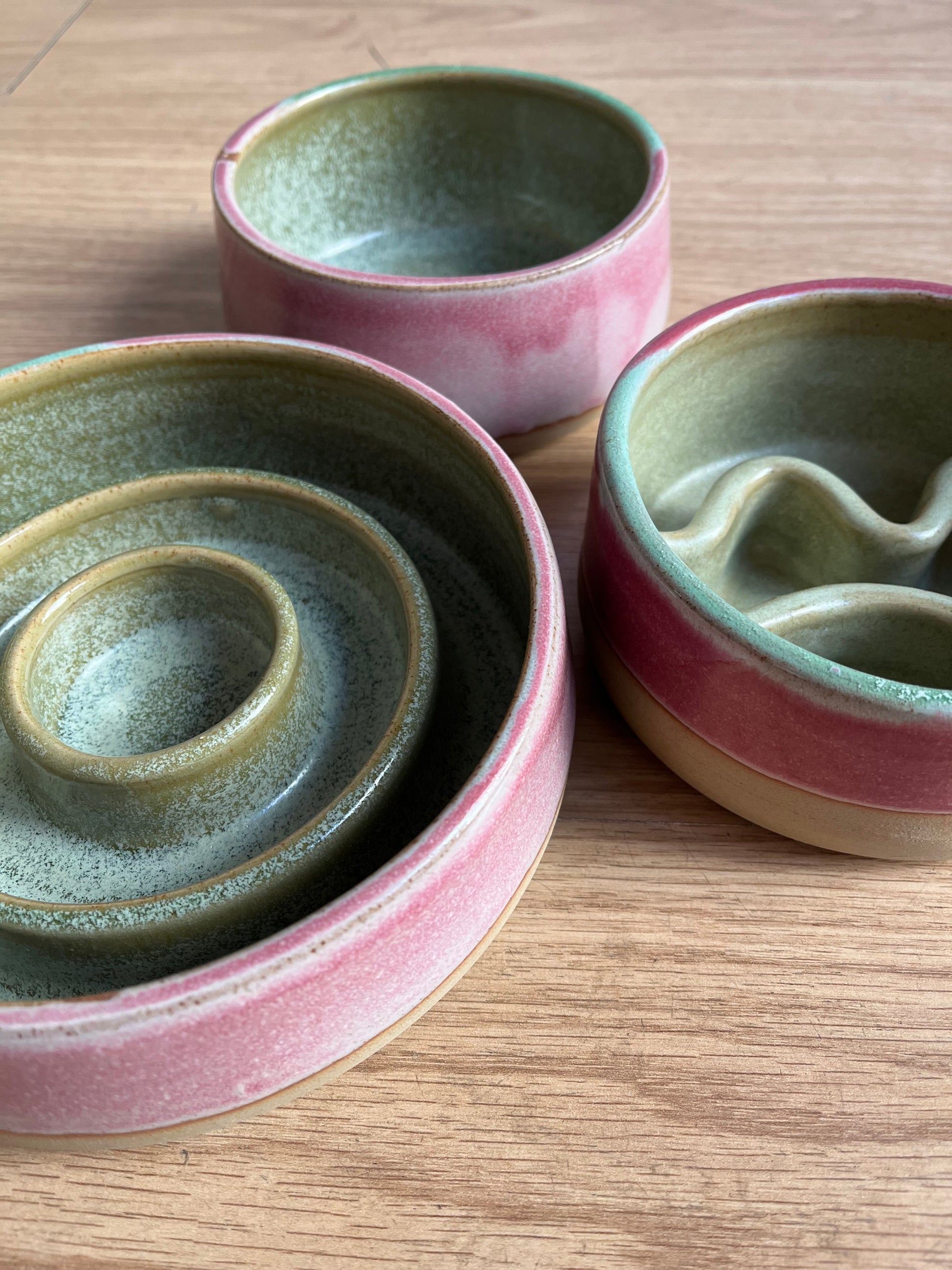 Ciotole anti ingozzamento per rallentare il pasto, fatte a mano in ceramica, con disegno interno a onde, disponibili in diverse taglie e colorazioni.